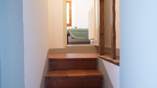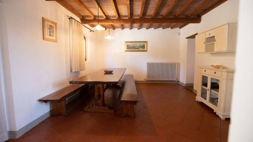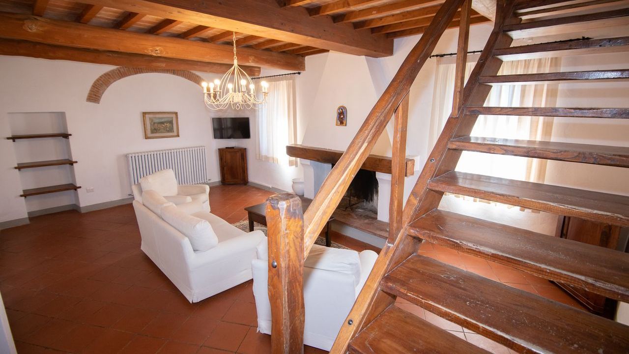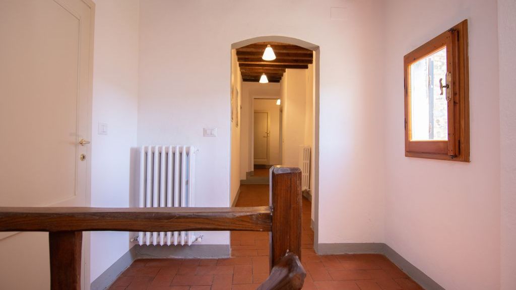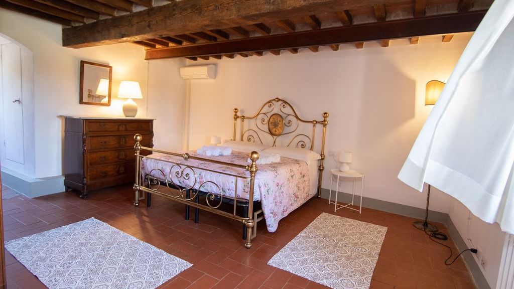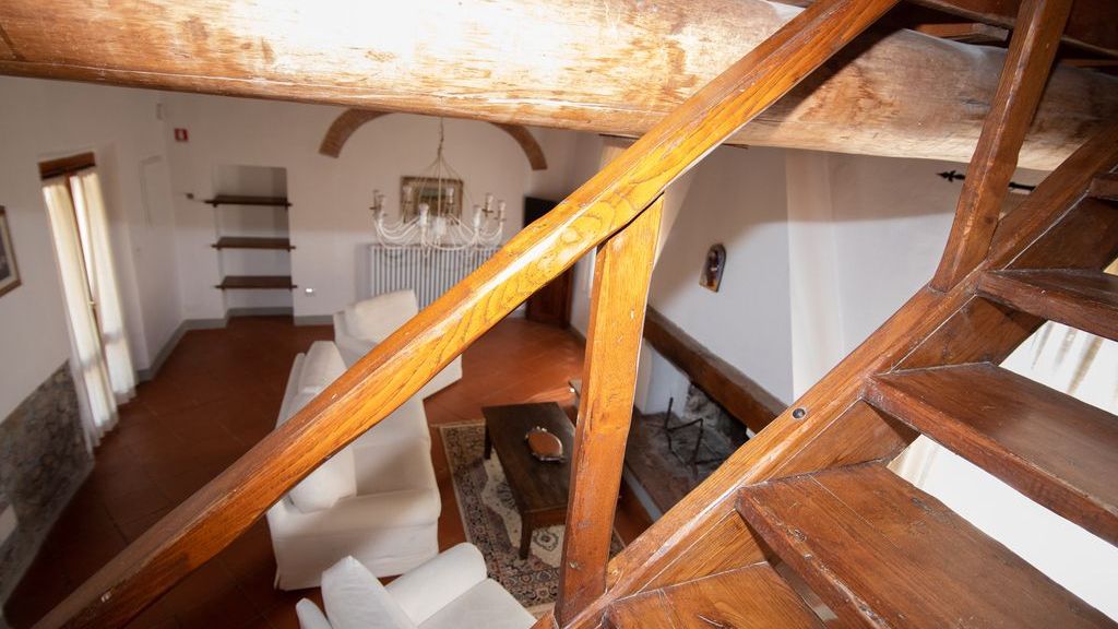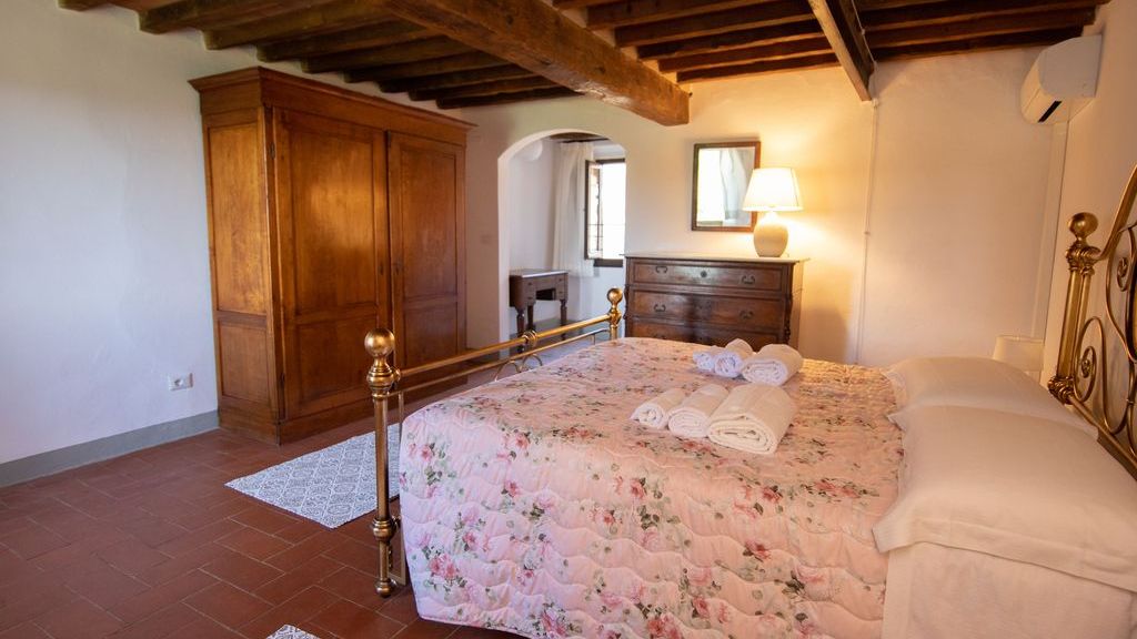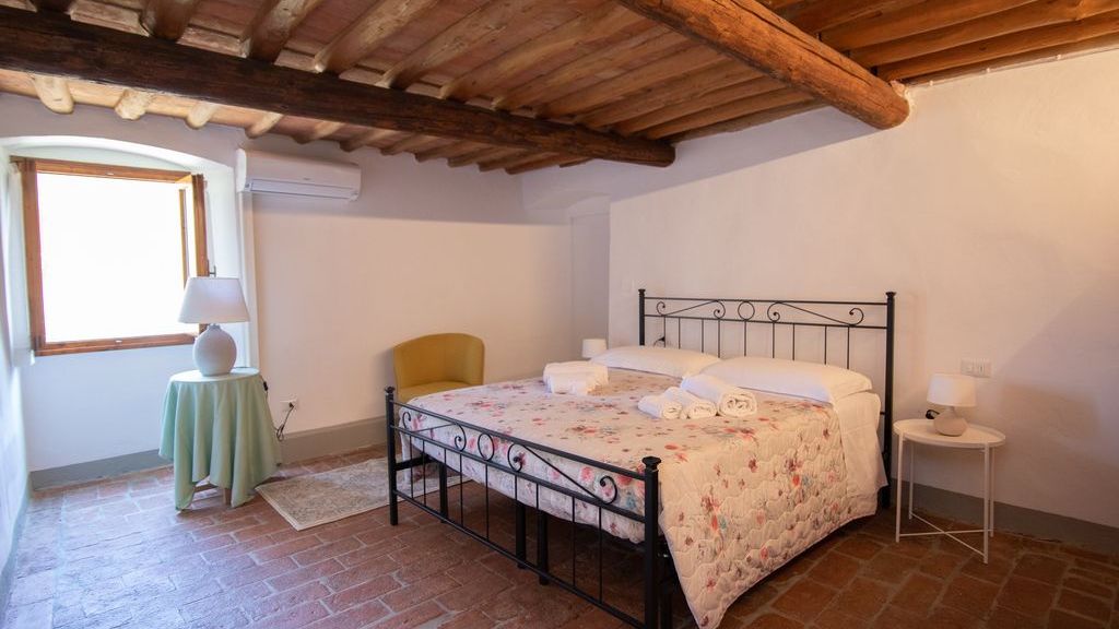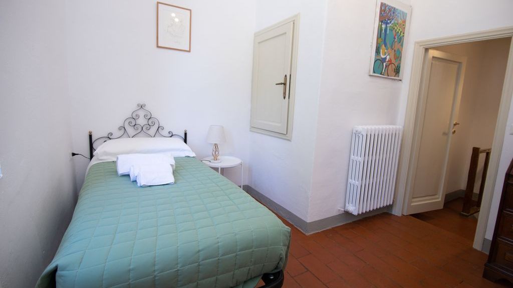 Eine Holztreppe führt ins Obergeschoss, wo es ein Schlafzimmer mit Einzelbetten, ein kleines Schlafzimmer mit einem Einzelbett und zwei Doppelbettzimmer mit Holz- und Ziegel-getäfelten Sichtbalkendecken, schmiedeeisernen Betten und typisch toskanischen Möbeln gibt. Auf der gleichen Etage befinden sich zwei Badezimmer.