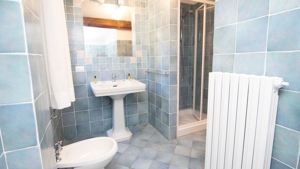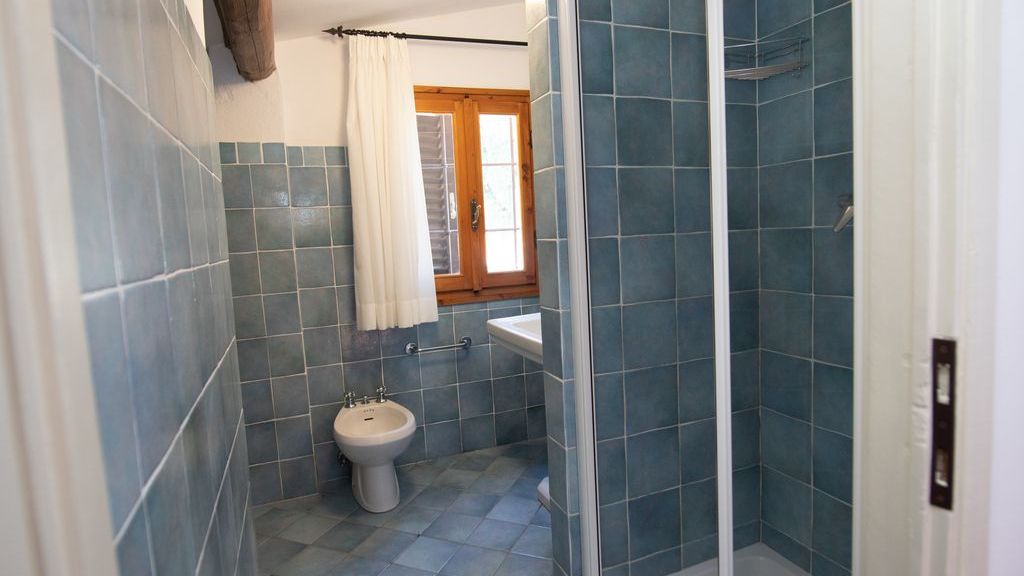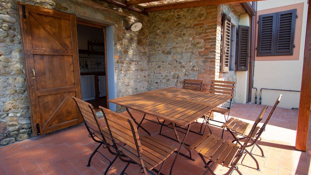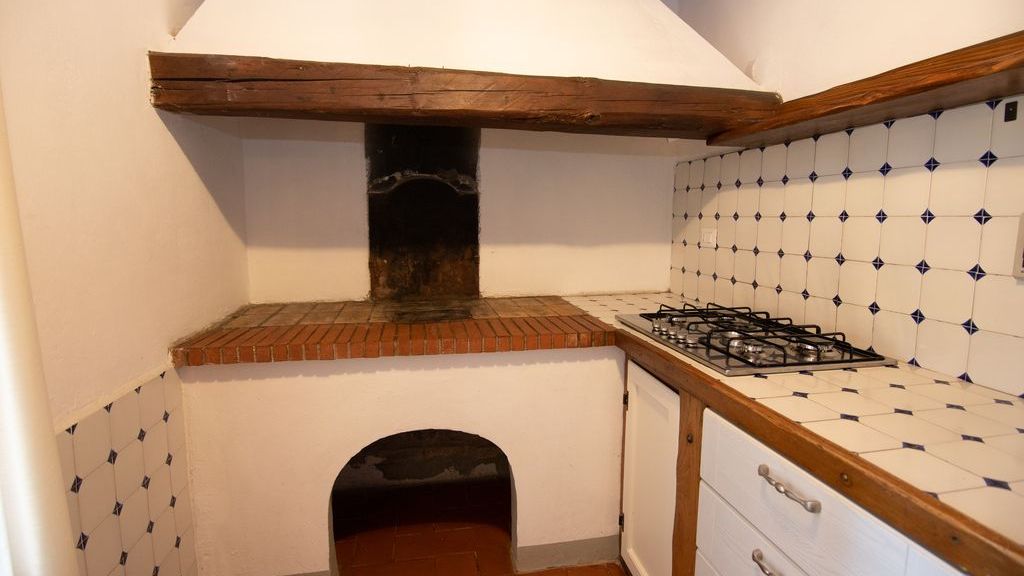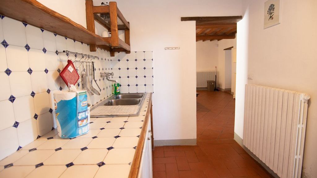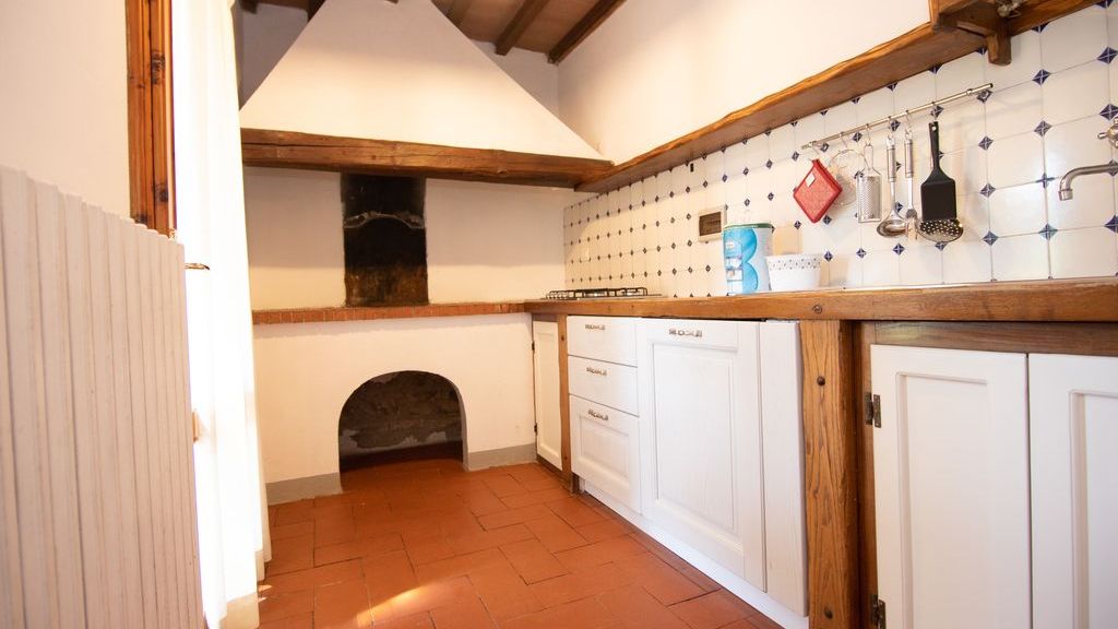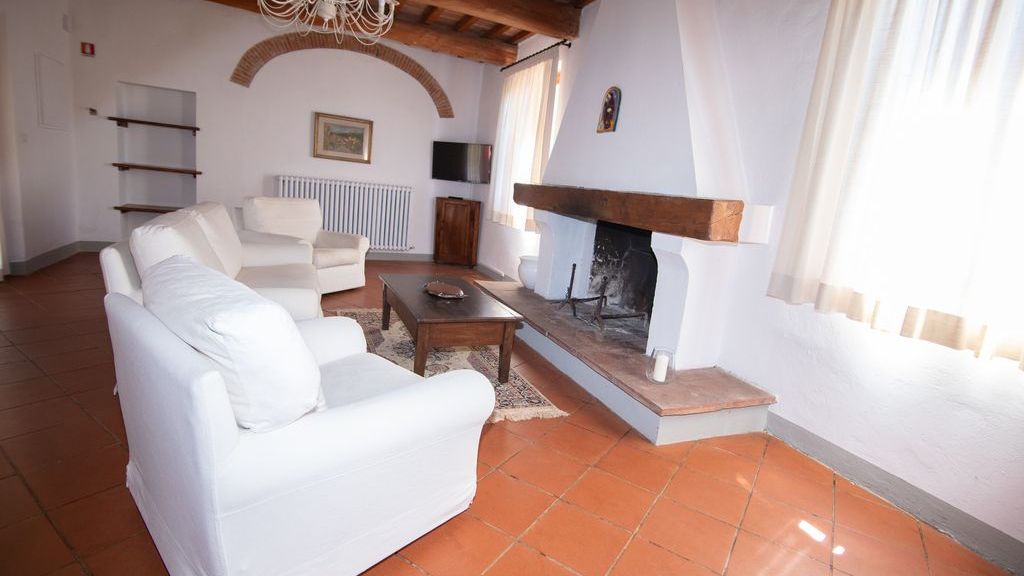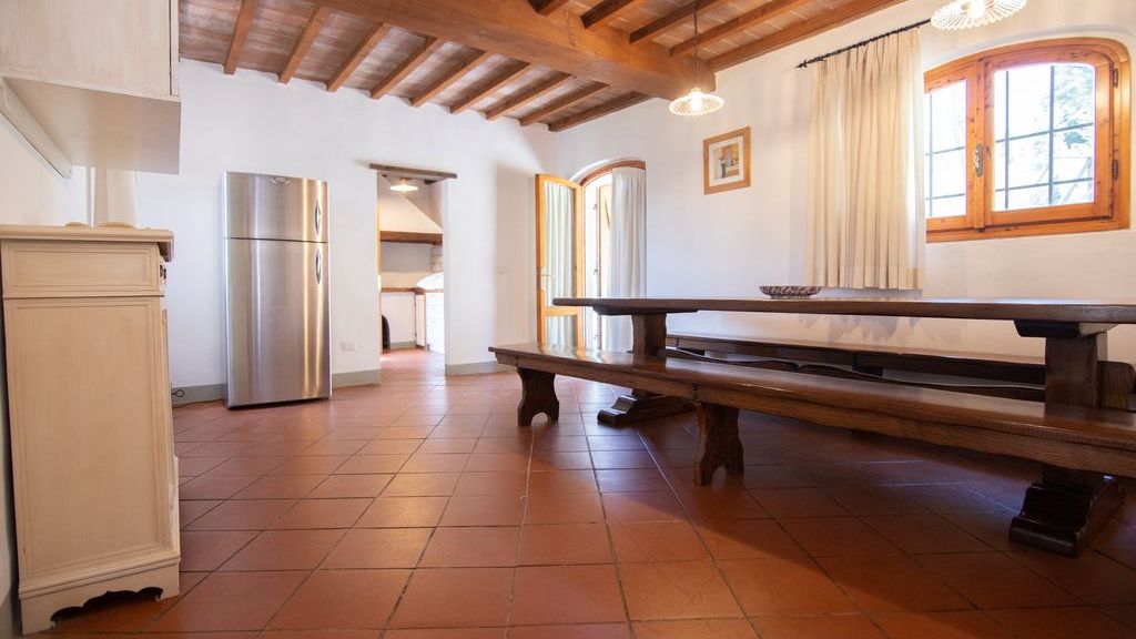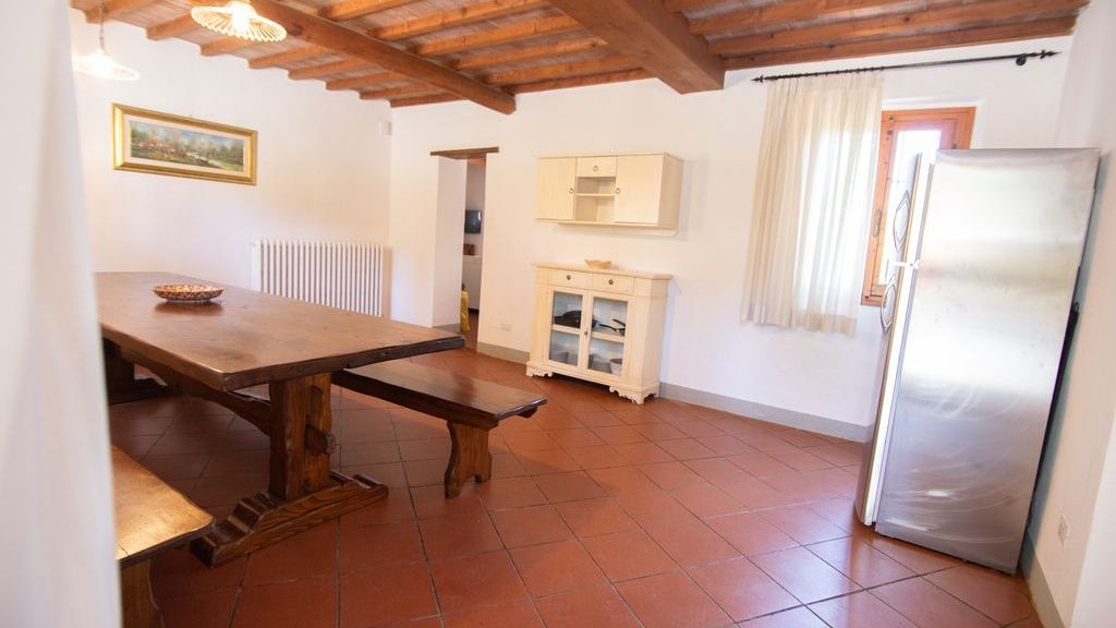 Eine Holztreppe führt ins Obergeschoss, wo es ein Schlafzimmer mit Einzelbetten, ein kleines Schlafzimmer mit einem Einzelbett und zwei Doppelbettzimmer mit Holz- und Ziegel-getäfelten Sichtbalkendecken, schmiedeeisernen Betten und typisch toskanischen Möbeln gibt. Auf der gleichen Etage befinden sich zwei Badezimmer.