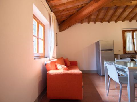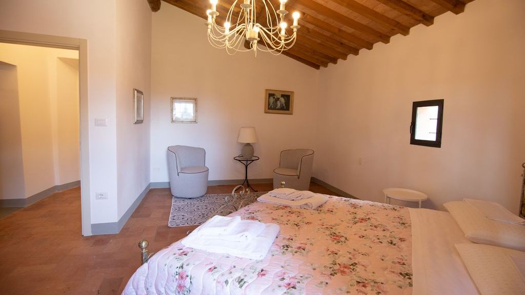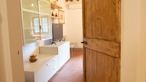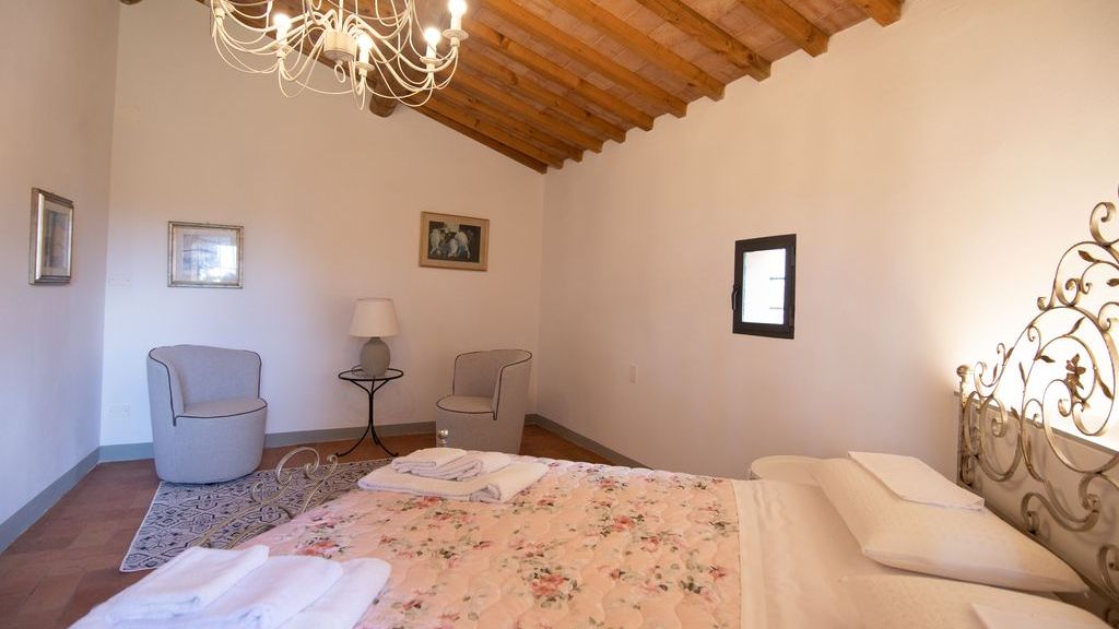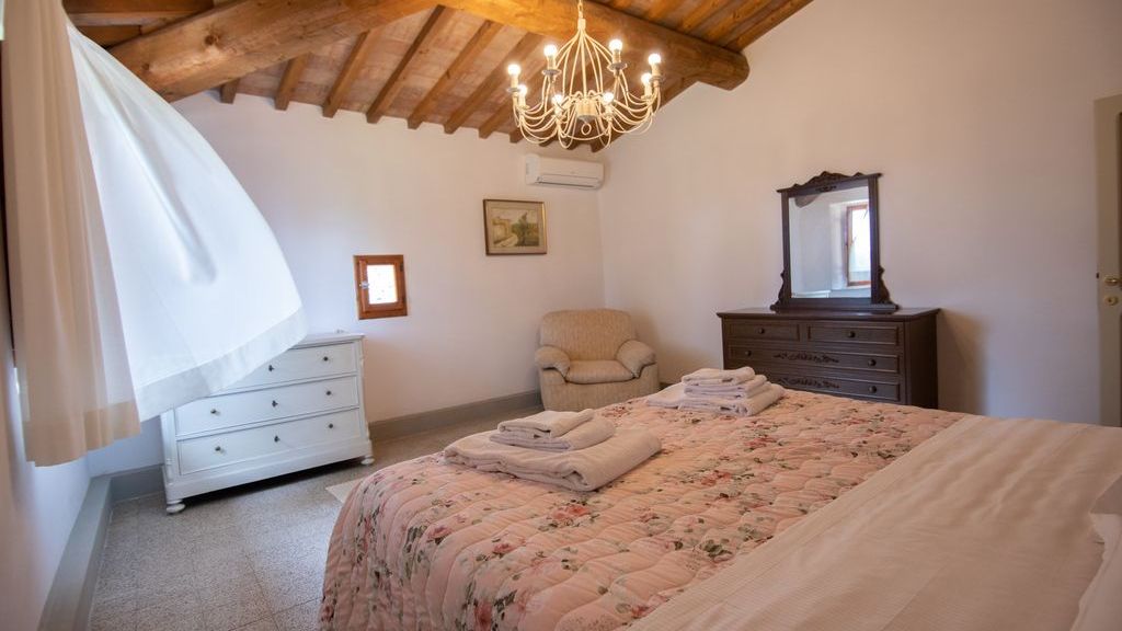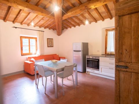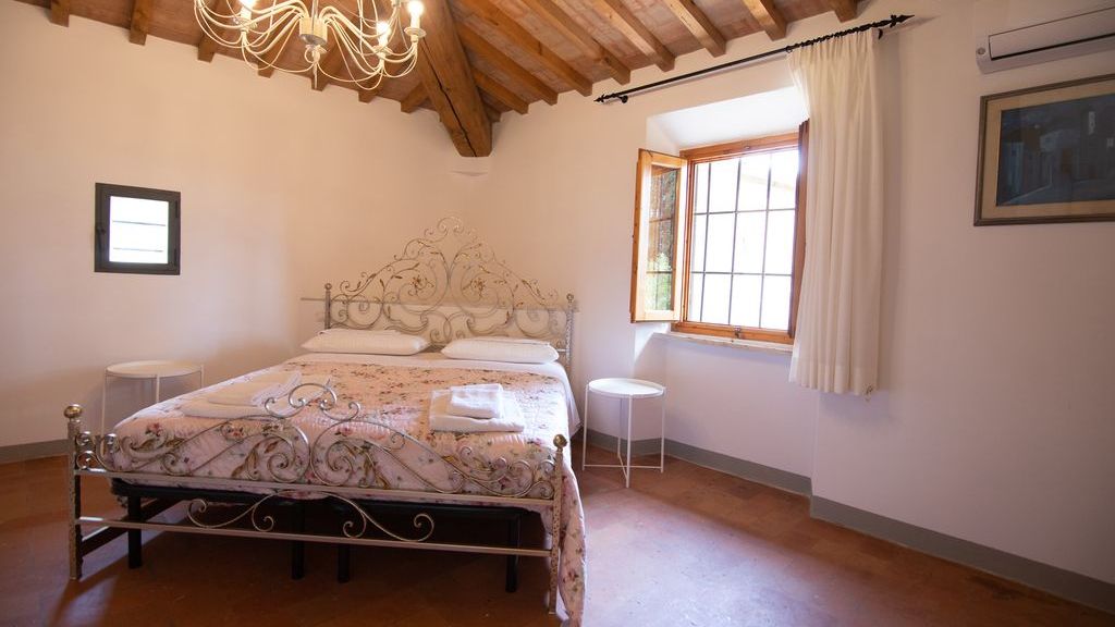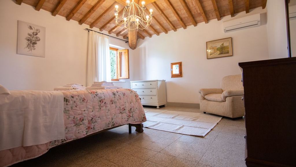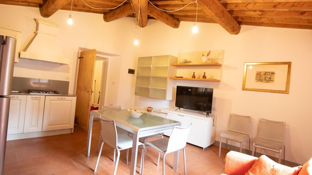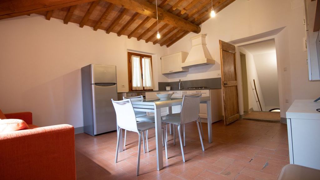 Die Wohnung ist für vier Personen eingerichtet und besteht aus einer Küche, zwei Doppelbettzimmern mit Blick auf das Tal und einem Bad. Die Einrichtung ist im toskanischen Stil gehalten und bewahrt die Charakteristiken der antiken Strukturen des Anwesens, wobei einige moderne Einrichtungsgegenstände hinzugefügt wurden.