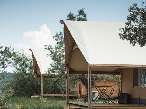 Die 4 ‚Trek‘-Zelte sind geräumig und perfekt in die Natur integriert. Sie bieten ein eigenes Bad mit Dusche, eine voll ausgestattete Küche, einen Wohnbereich, ein Schlafzimmer mit Doppelbett und Panoramablick, ein Schlafzimmer mit einem Etagenbett und einem Einzelbett, Kleiderschränke und eine große private Veranda mit Tisch und Stühlen, um die schöne Aussicht auf den Olivenhain zu genießen. Das schlichte und elegante Design dieser Einrichtung gibt den Gästen das Gefühl, in einer Unterkunft zu leben, die eher dem Luxus eines Hotelzimmers als dem eines Zeltes entspricht. Die Möbel sind alle aus handgefertigtem Naturholz.