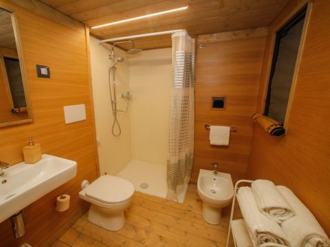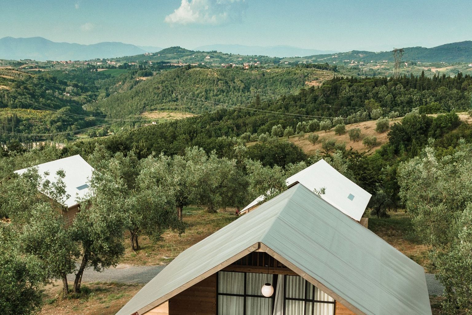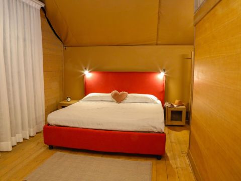 Die 2 ‚Safari‘-Zelte sind sehr geräumig und von der Natur umgeben. Sie verfügen über ein eigenes Bad mit Dusche, eine ausgestattete Küche, einen Wohnbereich, ein Schlafzimmer mit Doppelbett und ein Loft mit zwei Einzelbetten. Es gibt Kleiderschränke, eine sehr große private Veranda mit einer ausgestatteten Küche, Tisch und Stühlen mit Blick auf die Hügel der Farm. Diese Lösung ist auch für Menschen mit Behinderungen oder eingeschränkter Mobilität zugänglich. Das schlichte und elegante Design dieser Einrichtung gibt den Gästen das Gefühl, in einer Unterkunft zu leben, die eher mit dem Luxus eines Hotelzimmers als mit dem eines Zeltes vergleichbar ist. Die Möbel sind alle aus handgefertigtem Naturholz.
