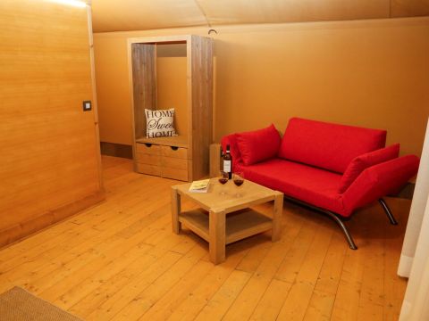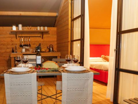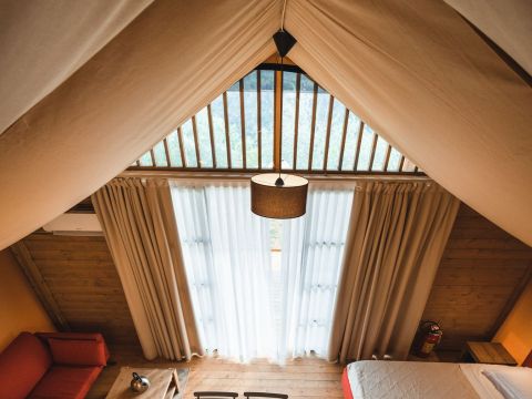 Das ‚Safari‘-Zelt, eine geräumige und elegante Umgebung mit einem großen Panoramafenster, um Natur und Komfort zu vereinen.