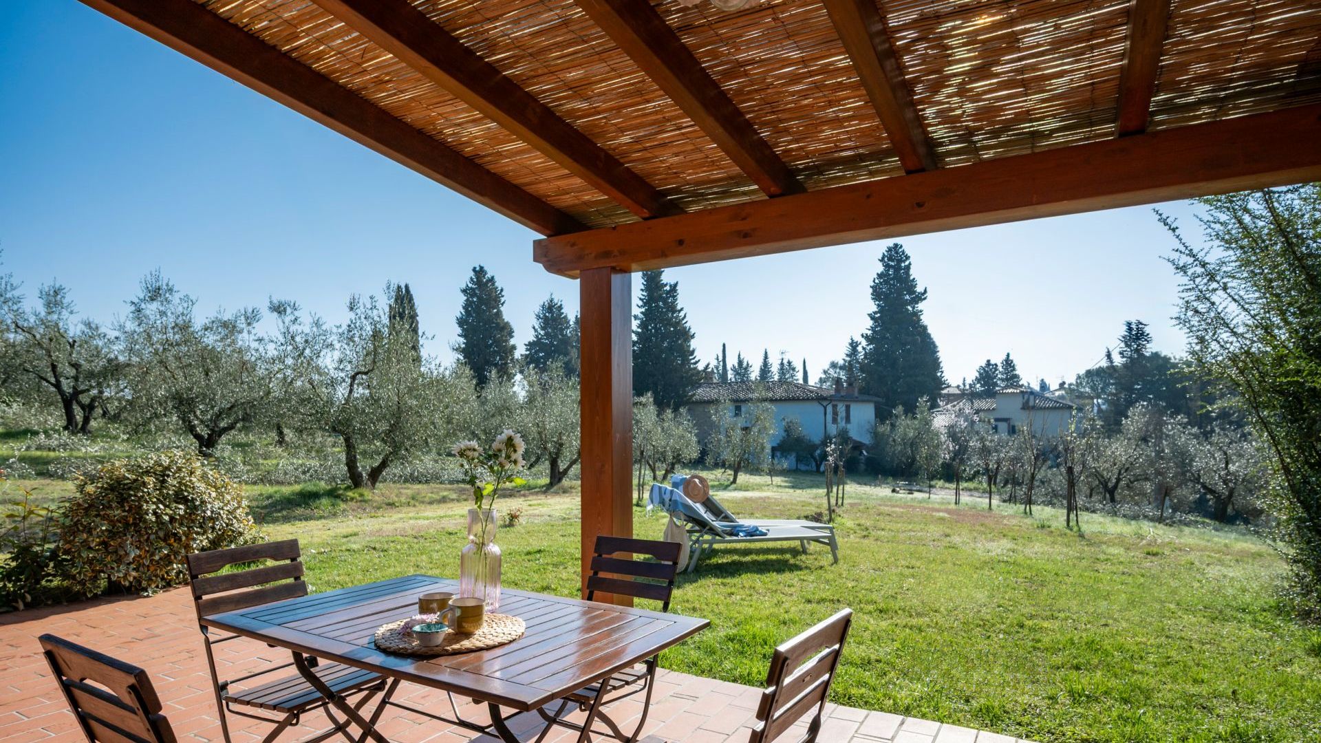 L'appartamento offre un ampio resede privato, con un bellissimo pergolato in legno per ripararvi dal sole durante i pranzi e le colazioni all'aperto. Una zona barbecue, con tavoli e sedie, vi permetteranno di godere al meglio dello spazio esterno. Nel borgo dell'agriturismo è presente un'ampia piscina con area relax, dove potrete sorseggiare un cocktail o assaporare l'armonia delle colline toscane. L'Agriturismo Casa Giani mette a disposizione degli ospiti anche un'area giochi per i bambini e una grande sala con loggiato esterno, per accogliere eventi e degustazioni.