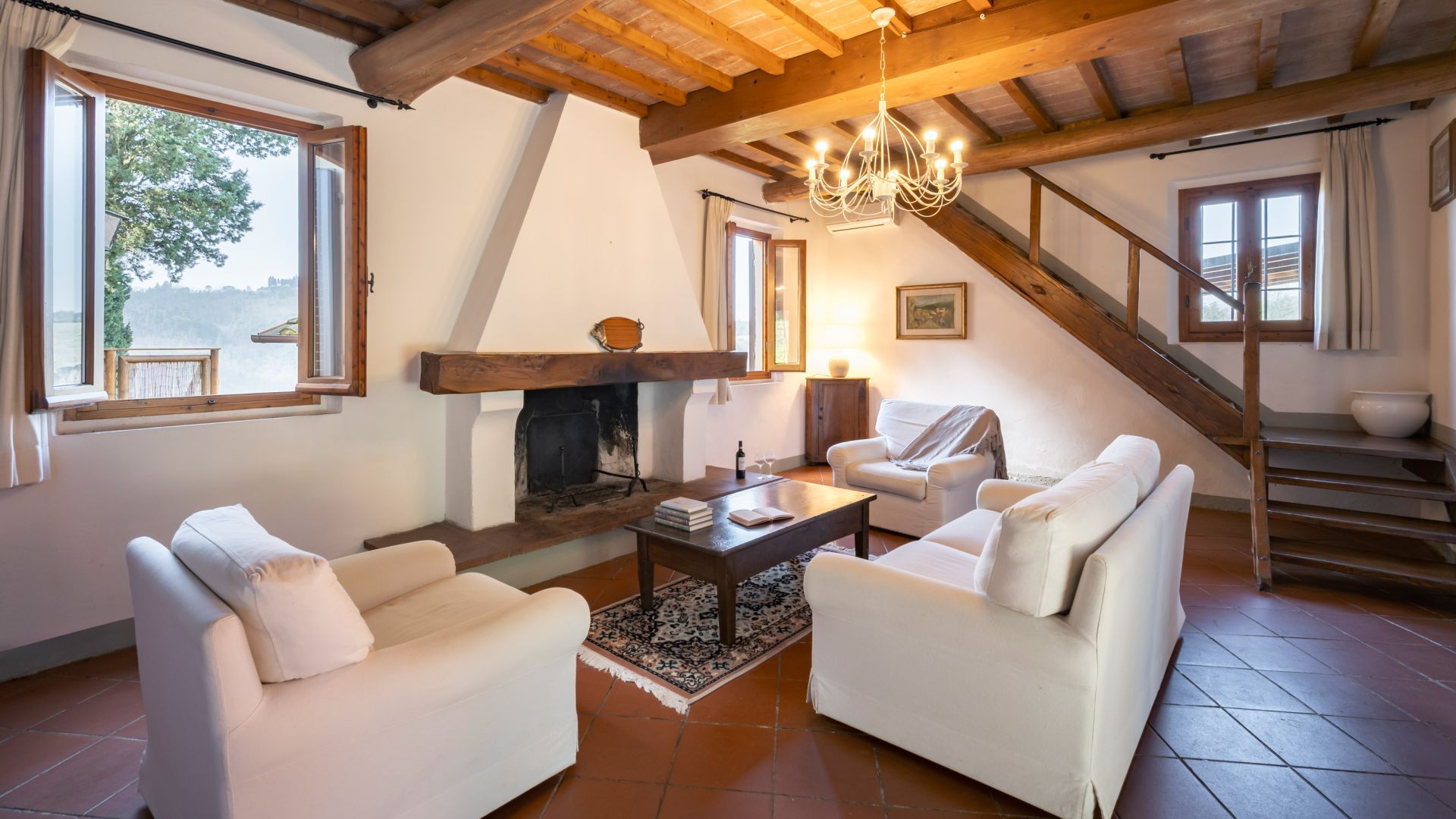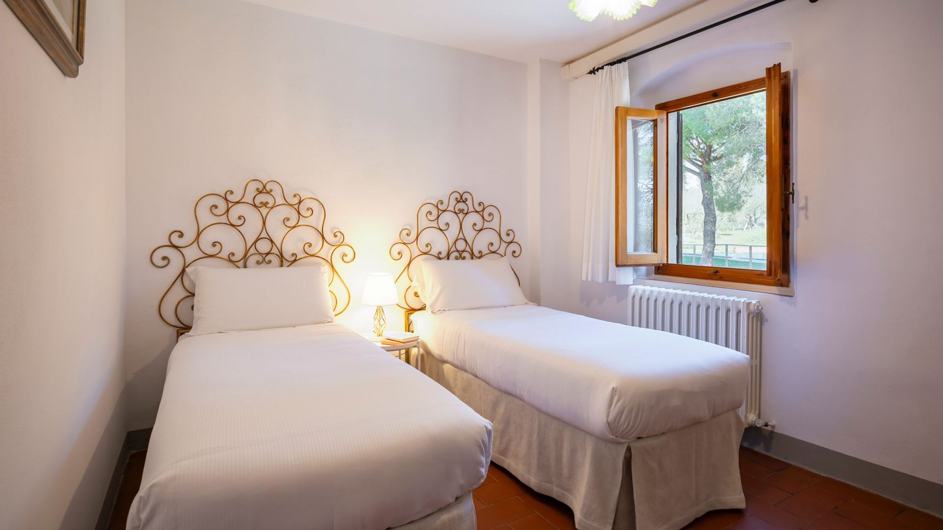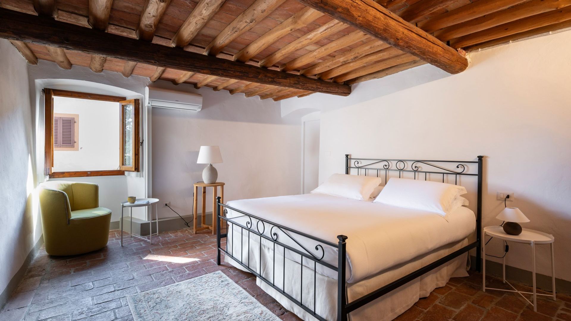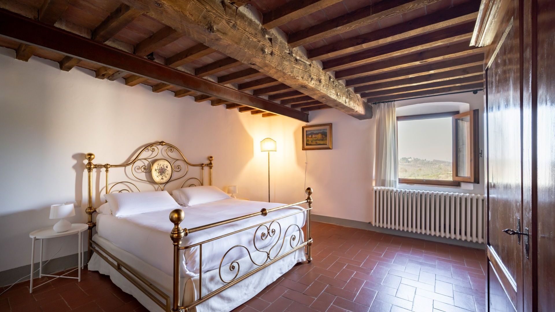 Una scala in legno conduce al piano superiore dove si trovano una camera con letti singoli, una piccola camera con un letto singolo e due camere matrimoniali con soffitto in legno e mattoni con travi a vista e letti in ferro battuto è l’arredamento tradizionale toscano, sullo stesso piano sono presenti due bagni privati.