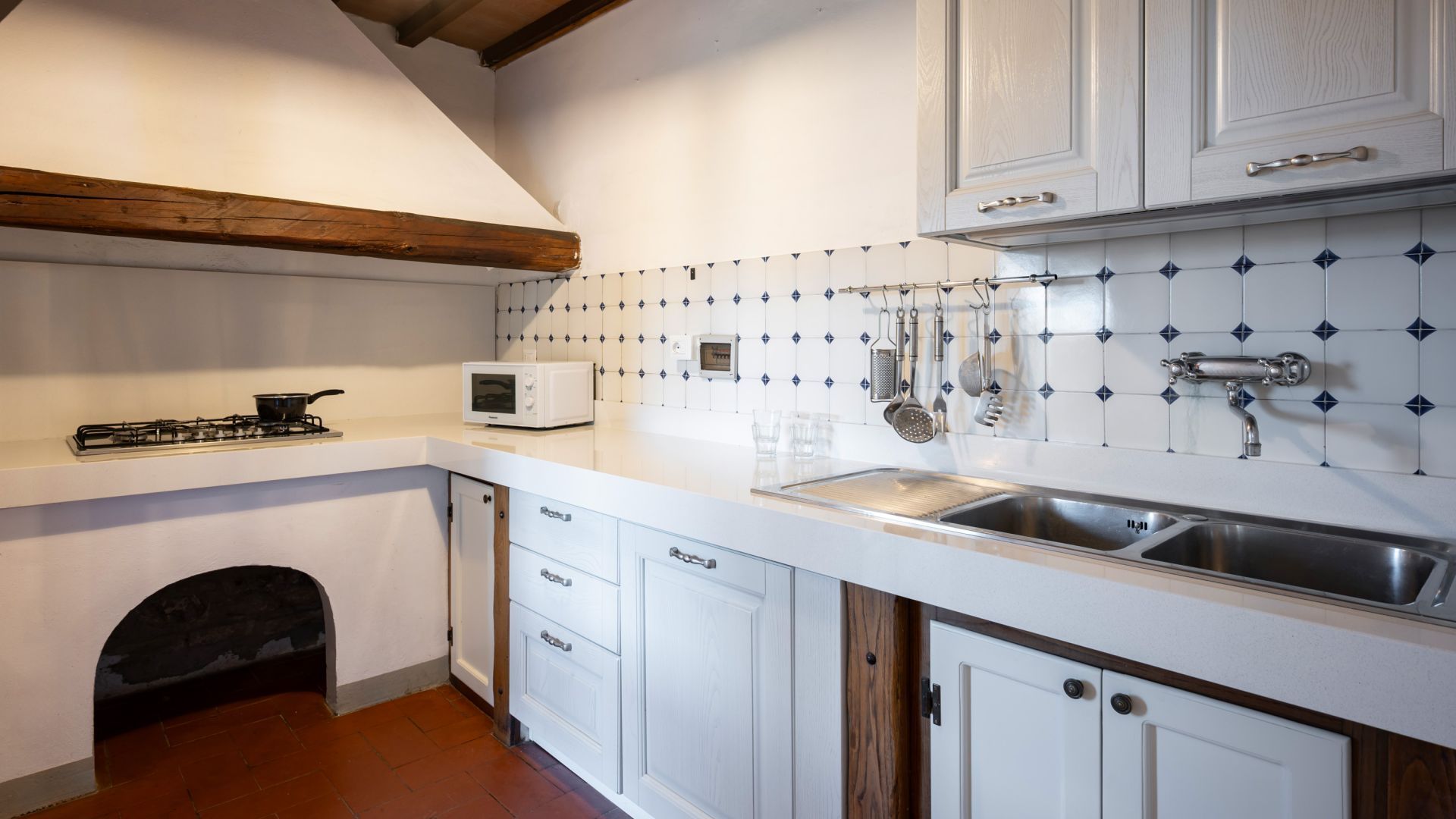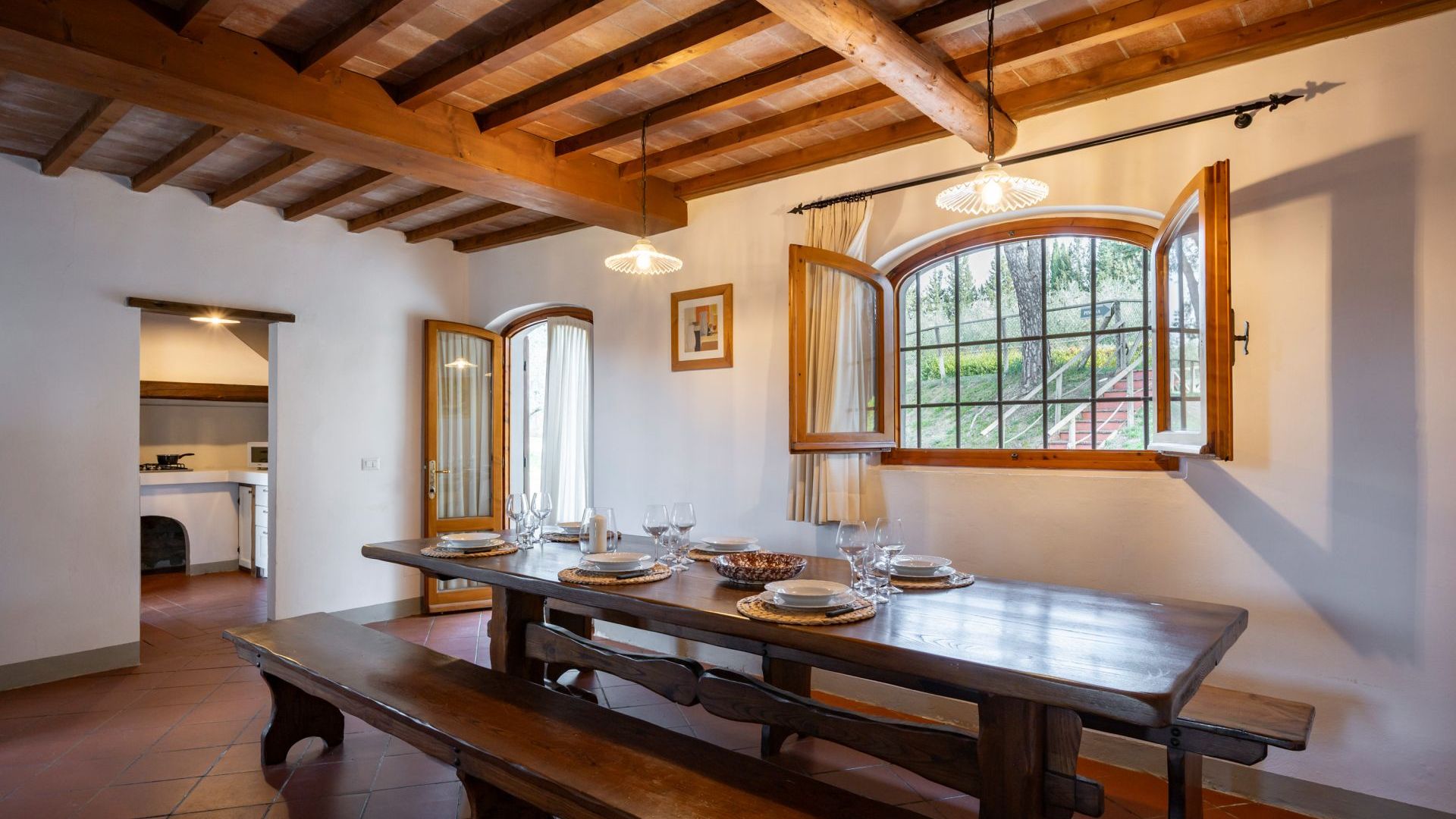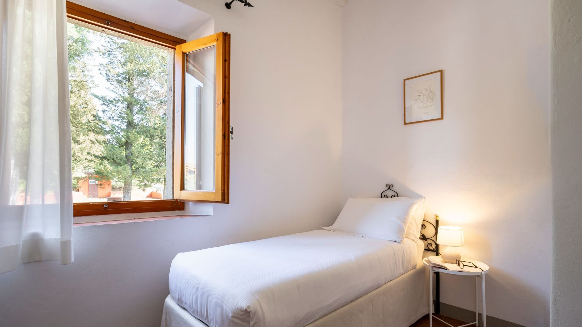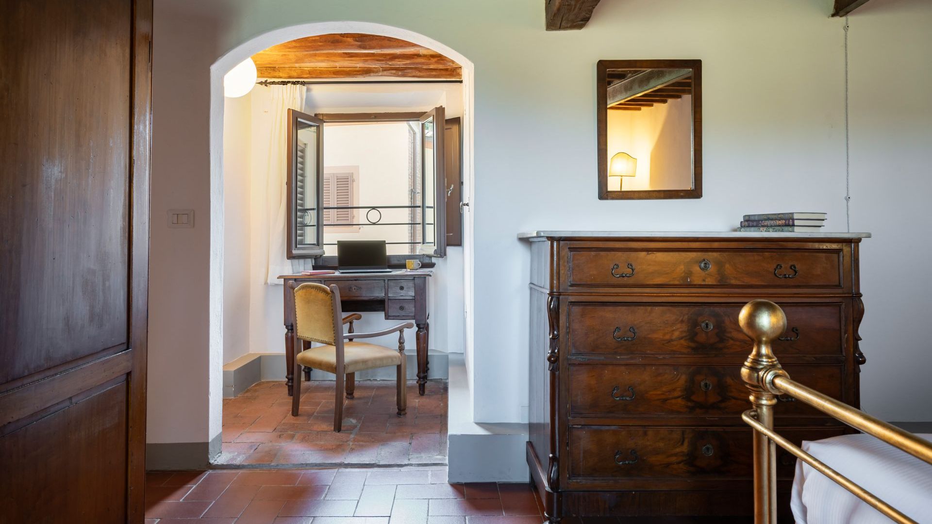 Una scala in legno conduce al piano superiore dove si trovano una camera con letti singoli, una piccola camera con un letto singolo e due camere matrimoniali con soffitto in legno e mattoni con travi a vista e letti in ferro battuto è l’arredamento tradizionale toscano, sullo stesso piano sono presenti due bagni privati.