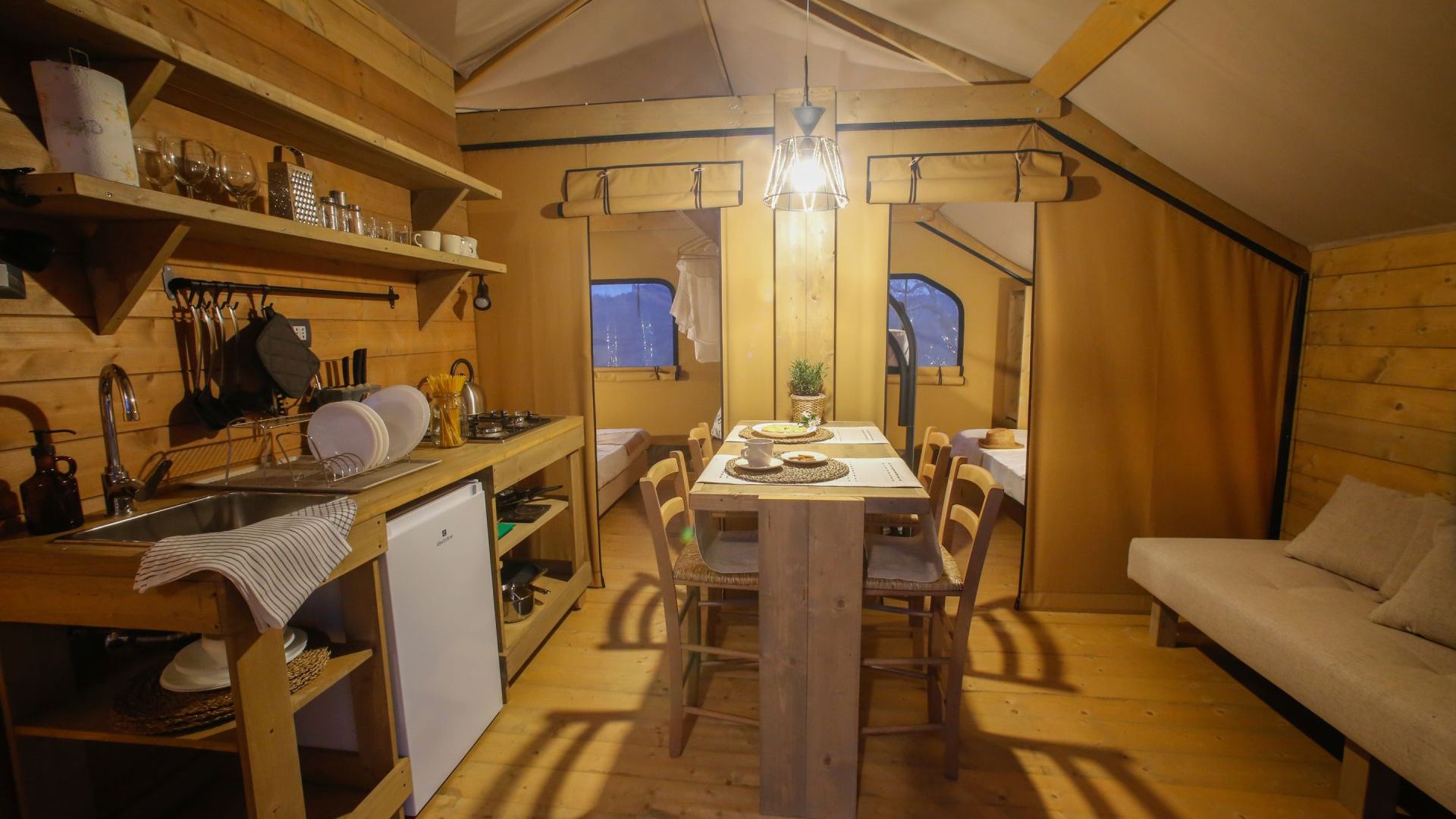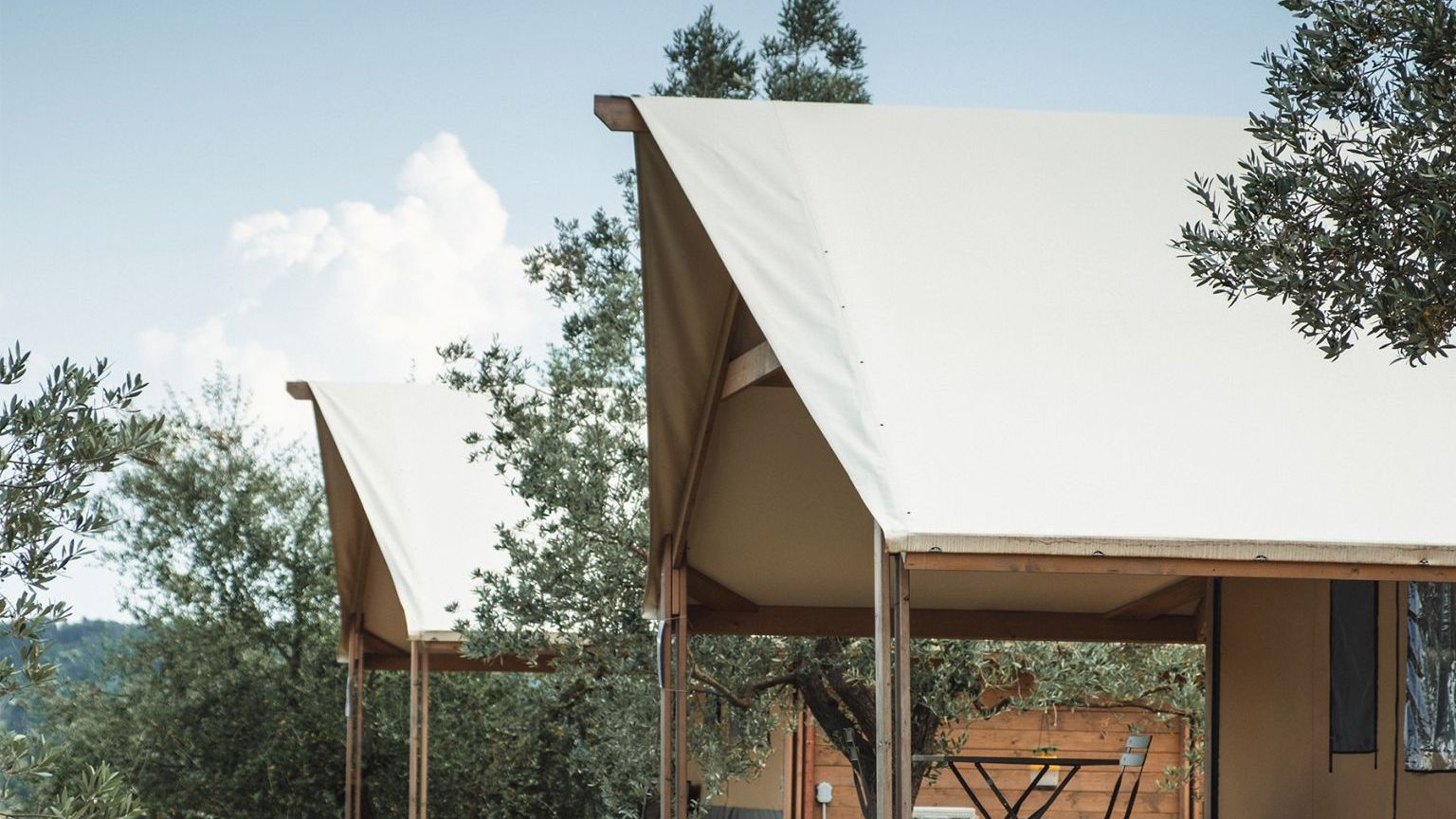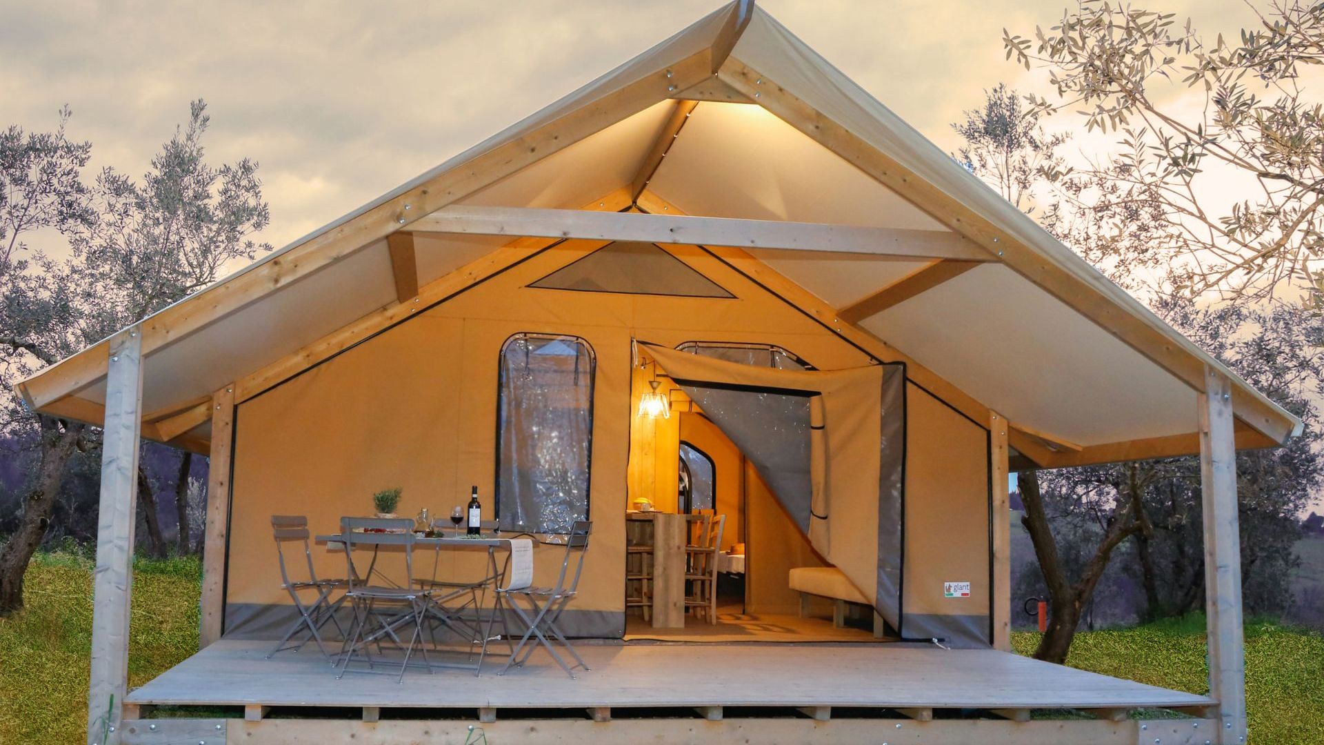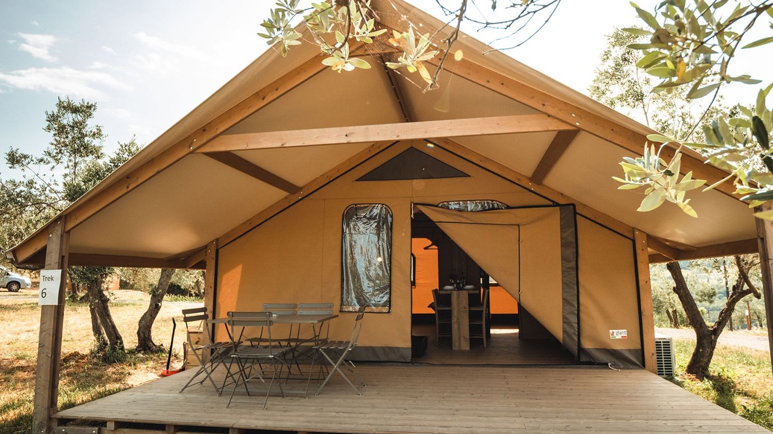 Le 4 tende “Trek” sono spaziose e perfettamente integrate nella natura. Offrono un bagno privato con doccia, cucina attrezzata, zona giorno, camera matrimoniale con vista panoramica, una camera con un letto a castello e un letto singolo, armadi, una grande veranda privata con tavolo e sedie per godere della splendida vista sull’oliveta. Il design sobrio ed elegante di questi mobili darà agli ospiti la sensazione di vivere in un alloggio paragonabile al lusso di una stanza d’albergo piuttosto che ad una tenda. Gli arredi sono tutti in legno naturale fatti a mano.