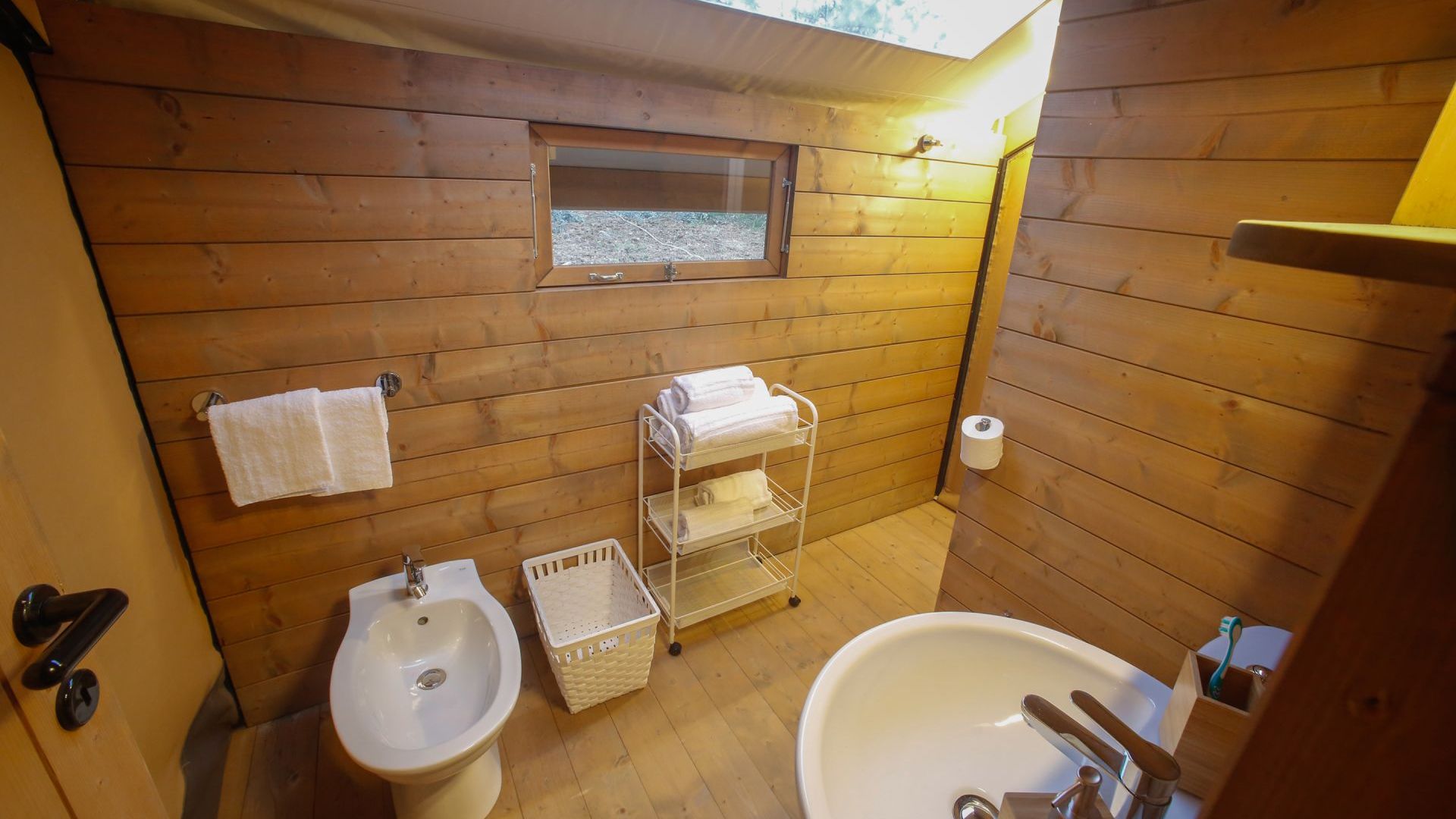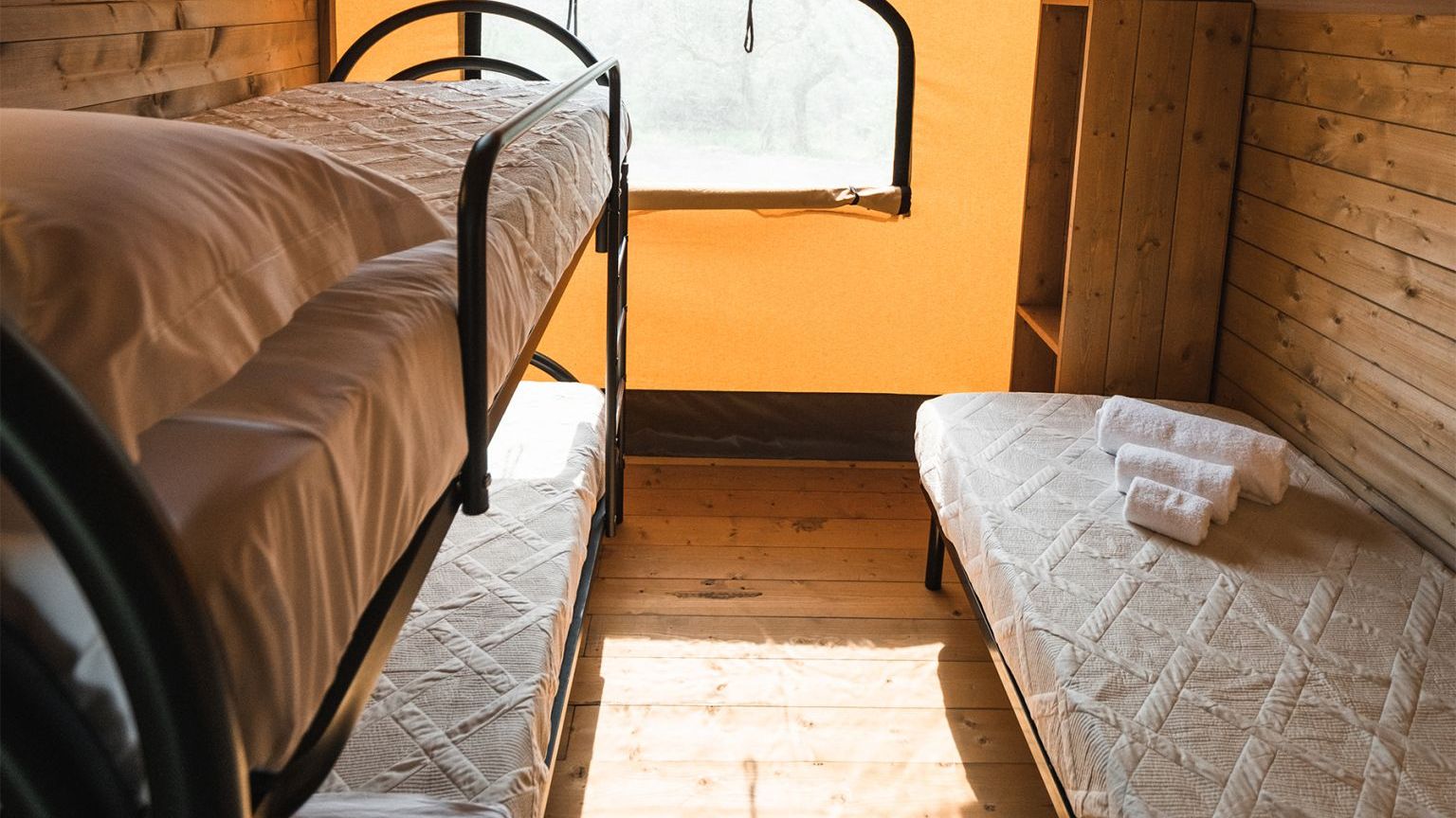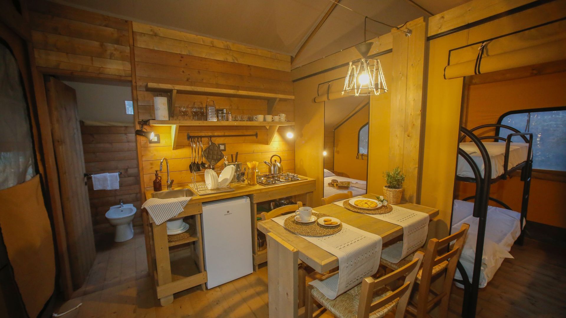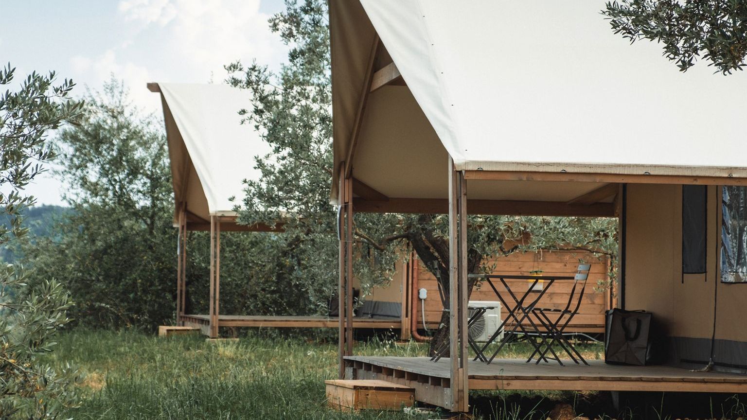 Le 4 tende “Trek” sono spaziose e perfettamente integrate nella natura. Offrono un bagno privato con doccia, cucina attrezzata, zona giorno, camera matrimoniale con vista panoramica, una camera con un letto a castello e un letto singolo, armadi, una grande veranda privata con tavolo e sedie per godere della splendida vista sull’oliveta. Il design sobrio ed elegante di questi mobili darà agli ospiti la sensazione di vivere in un alloggio paragonabile al lusso di una stanza d’albergo piuttosto che ad una tenda. Gli arredi sono tutti in legno naturale fatti a mano.