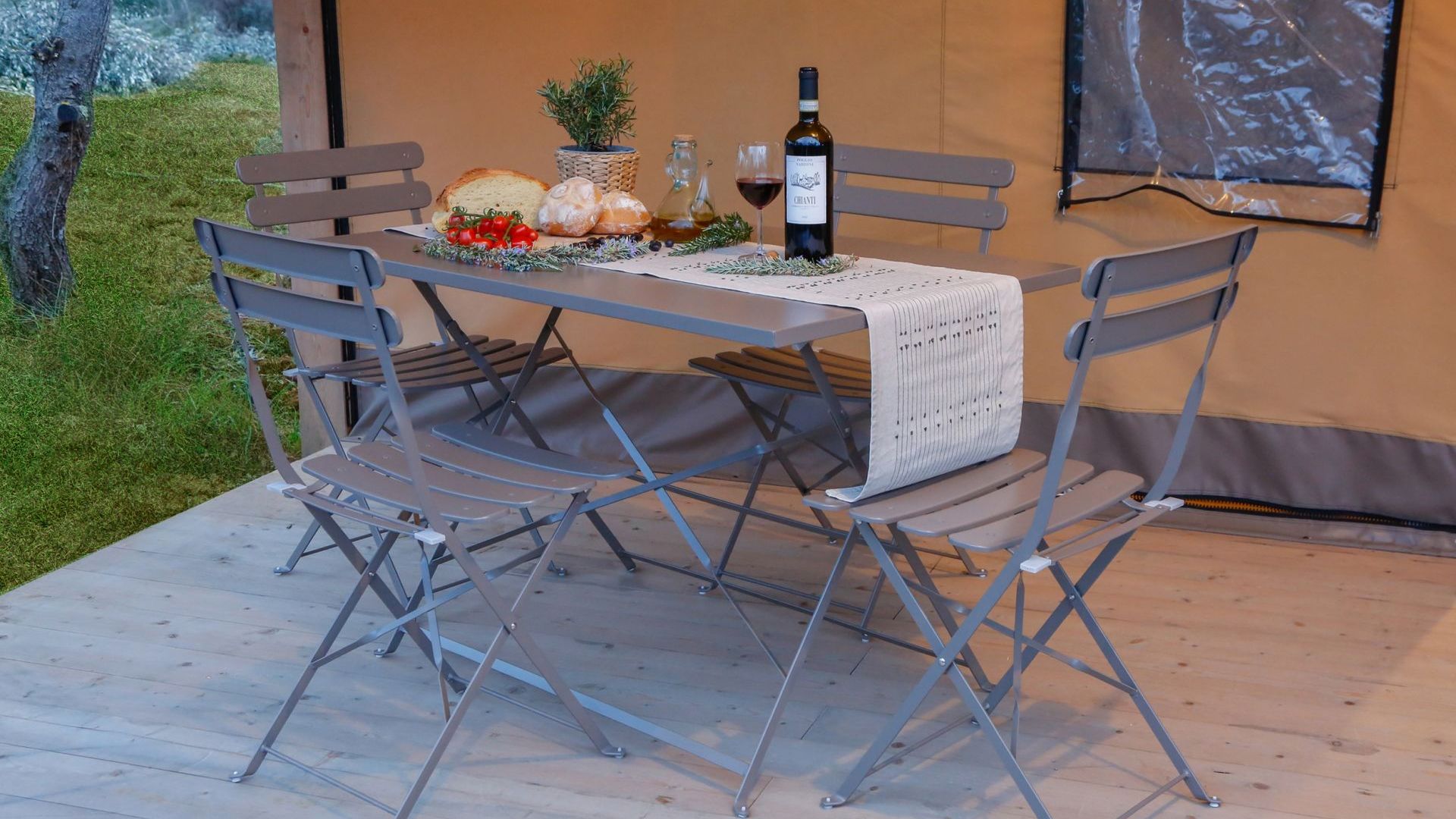 Veranda privata attrezzata con tavolo e sedie pieghevoli in acciaio verniciato